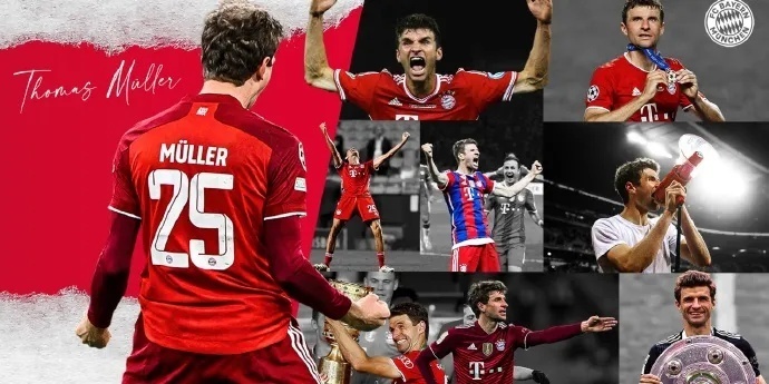 穆勒在年仅10岁时就加入了拜仁,过去的25年里从未离开过。穆勒拜仁生涯756场贡献250球276助攻,帮助球队赢得了2座欧冠、2座欧超杯、13座德甲、6座德国杯、8次德超杯和2座世俱杯。