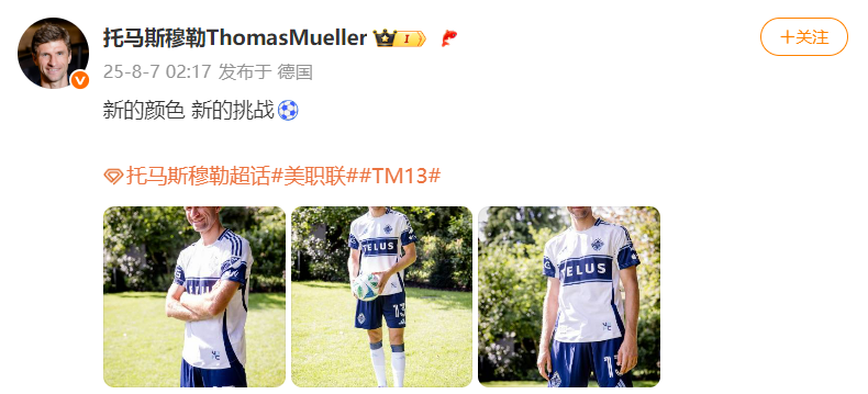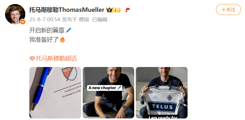 北京时间8月7日凌晨,前拜仁球星托马斯·穆勒在其个人社媒晒照并发文“开启新的篇章,我准备好了”,官宣加盟美职联温哥华白浪足球俱乐部。