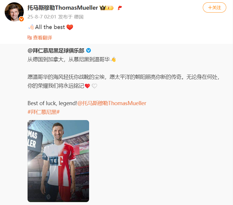 随后,拜仁官方发文祝福:从德国到加拿大,从慕尼黑到温哥华。愿温哥华的海风轻抚你战靴的尘埃,愿太平洋的朝阳照亮你新的传奇。无论身在何处,你的荣耀我们将永远铭记!穆勒转发回应:All the best!